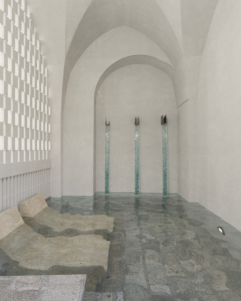 I materiali scelti, travertino e pietre naturali, richiamano le rocce attraversate dal fiume nel suo percorso segreto. Le piscine riscaldate evocano le antiche vasche d’abluzione, mentre fontane, giochi d’acqua, sauna e bagno turco rievocano gli elementi della terra e dell’acqua da cui tutto nasce.