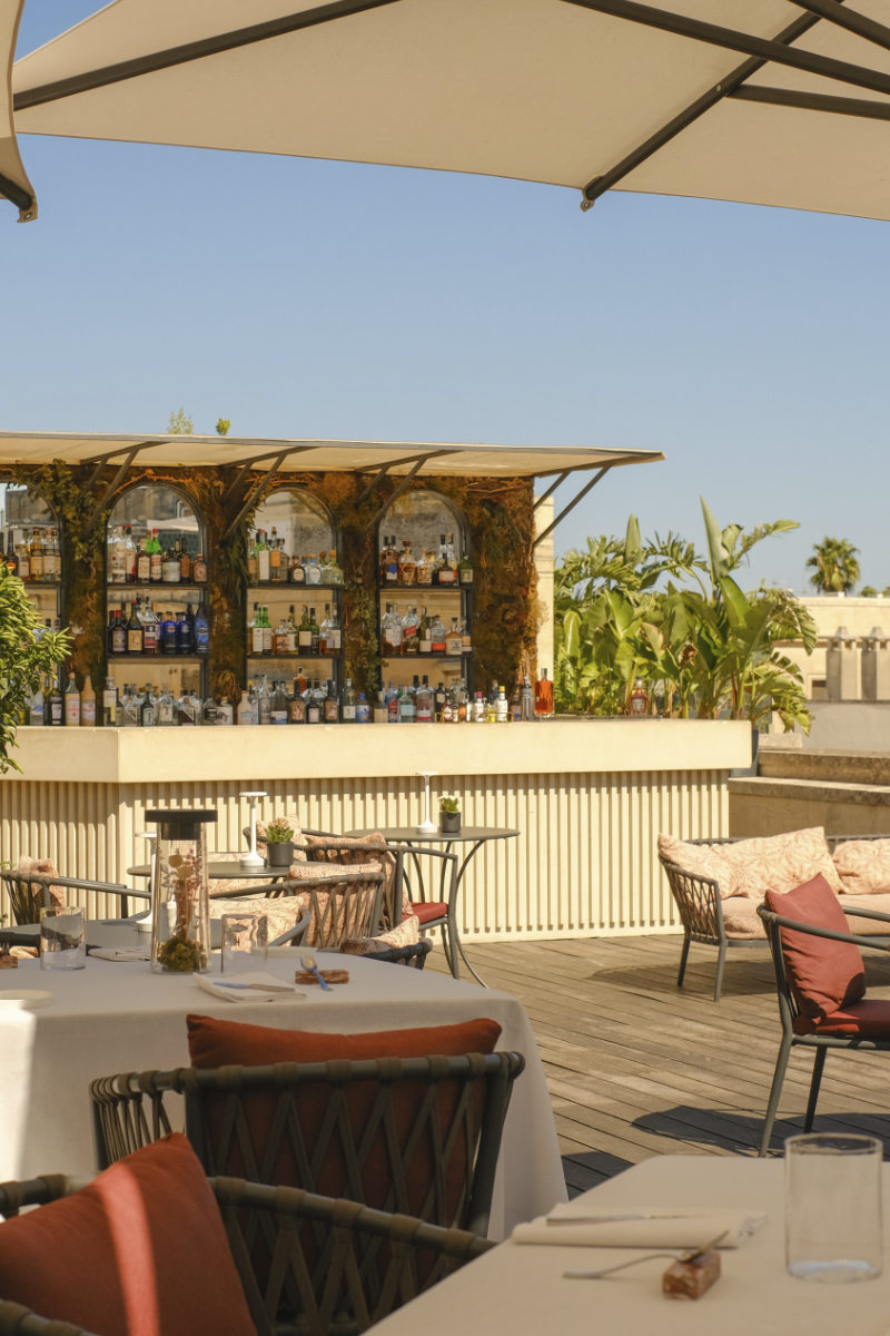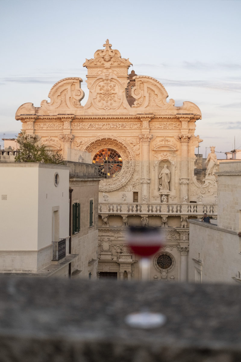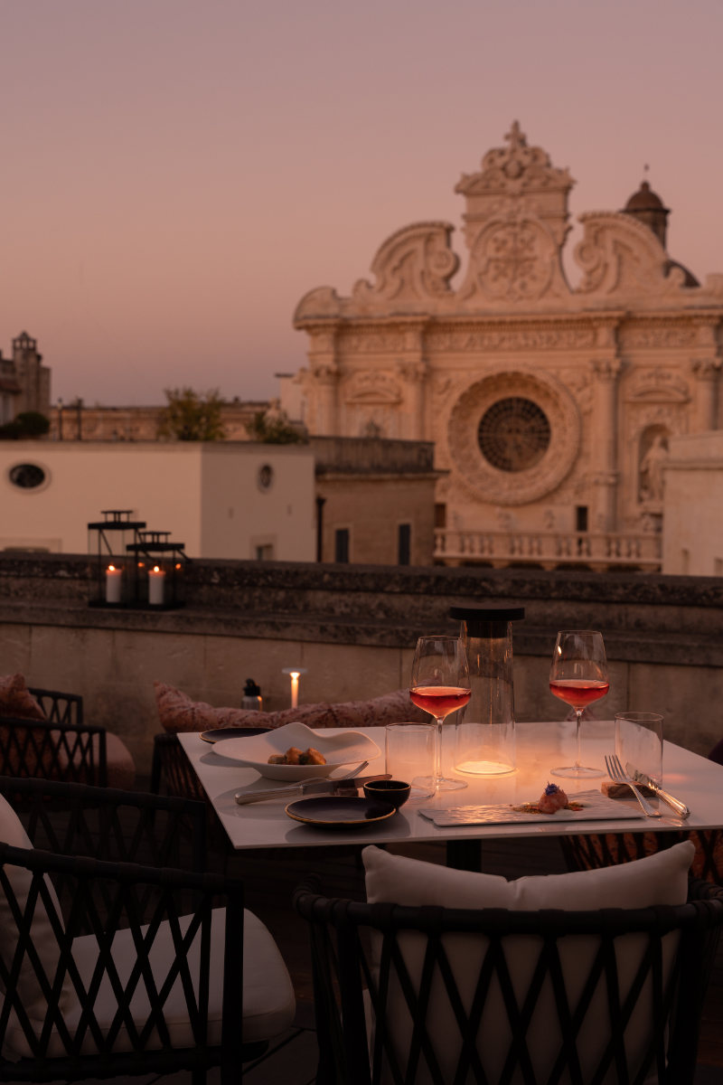 Sul nostro rooftop ogni dettaglio richiama la dolce vita salentina: il tempo dilatato dell’aperitivo, il piacere della conversazione, il gesto semplice e raffinato di un cocktail preparato con cura. La città diventa scenografia, mentre la pietra dorata di Santa Croce si accende nella luce del tramonto e accompagna i momenti più piacevoli della giornata.